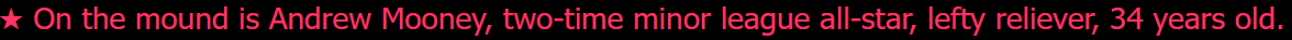 Andrew ‘Moondog’ Mooney Andrew Cochrane Mooney (born June 17, 1990), nicknamed "Moondog" is an American professional baseball pitcher for the Las Venturas Bandits of Minor League Baseball (MiLB). He has played in MLB briefly for the Los Santos Corkers. Amateur career Mooney is from Whetstone, San Andreas. He attended Angel Pine High School and played for the school's baseball team. He pitched a no-hitter in his final high school game. Mooney attended University of San Andreas, Los Santos and played college baseball. As a freshman in 2009, he was the Mid-American Conference Freshman of the Year after he had a 1.68 earned run average (ERA), six saves and 49 strikeouts over 35+2⁄3 innings pitched. In 2012, he underwent Tommy John surgery and missed the 2012 season. He returned in 2013 as a starter and had a 2.02 ERA with 105 strikeouts over 89 innings. After the 2013 season, he played collegiate summer baseball with the Carcer City Killers. Mooney received a second surgery in August 2024 to repair torn ligaments in his left arm. Personal life Mooney and his wife Shelly have two children, a daughter and son, Little Lisa and Little Billy. In December 2016, Mooney was arrested for domestic assault, although the court case was retired and would be dismissed in December 2018 if no further incidents occur. In March 2020, Mooney tested positive for PED (performance enhancing drugs), suspending his season. Mooney travels on a Harley Davidson bike, is often seen on various golf courses in San Andreas. According to a 2024 social media post, Mooney is rumored to be retiring from baseball if a contract negotiation does not meet his demands. In 2025, Andrew was seen with his wife and kids in good spirits. He appeared to be healthier, now out of his cast and working out. He continues to ride his bike around the desert and Red County, sporting a biker jacket—but with no affiliation, and a declining stream of income, he seeks to join up with a biker gang, going to bike weeks, events and gatherings. He recently started building and collecting Harley-Davidson bikes.